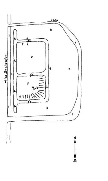 Maar het is ook heel goed mogelijk , gezien onderstaande schets , dat het slot aan de westkant van de Saale in een toen bestaande meander werd gebouwd. En dat de slotgracht werd voltooid door de meander door te steken. ( zie : H Frank)